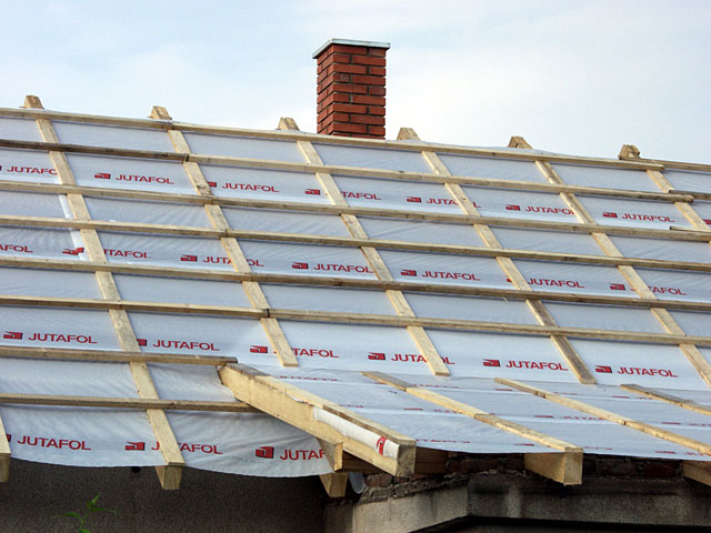 Если предполагается оборудование теплого чердачного помещения или мансарды, укладывается кровельный пирог из трех слоев: пароизоляция, теплоизоляция и гидроизоляция. Утеплитель укладывается между стропилами. На него с внутренней стороны крепится пароизоляция, а с наружной стороны стропильной системы укладывается гидроизоляционный слой. Пленку нужно крепить не натягивая, а оставляя небольшое провисание. Для обеспечения вентиляционного зазора между профнастилом и гидроизоляционной пленкой устанавливается контробрешетка.