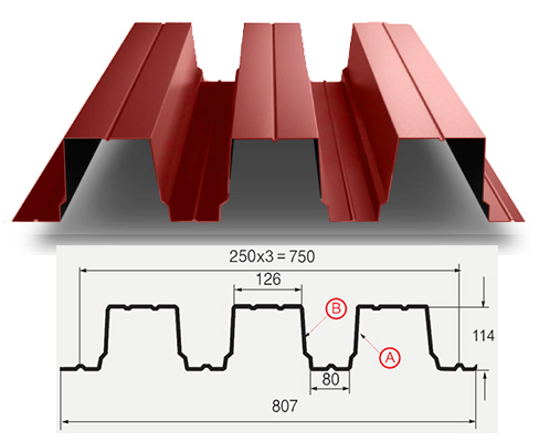 Для применения в конструкциях покрытия плоских, малоуклонных и скатных кровель специально разработан профнастил марки Н-114х750. Холоднокатаный профиль отличается высотой ребер в 114 мм с шагом размещения в 80 мм. На ребрах жесткости сделаны две капиллярные канавки, а по бокам гофры специальные поштамповки, придающие конструкции большую устойчивость к высоким нагрузкам. Марка Н-114 производится из стального оцинкованного проката толщиной в 0,7-1,0 мм. Готовая продукция может быть дополнительно покрыта специальным полимерным покрытием для улучшения эксплуатационных характеристик и внешнего вида.